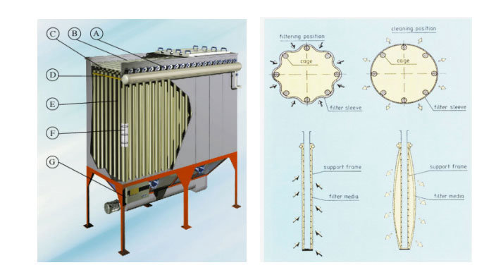 濾袋、籠骨和花板-----濾袋和籠骨組成了除塵器的濾灰系統(tǒng);花板用于支撐濾袋組件和分隔過濾室(含塵段)及凈氣室,并作為除塵器濾袋組件的檢修平臺;濾袋組件從花板裝入
